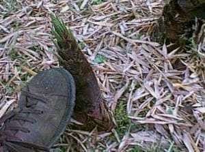 Aborting shoots is a good method of control but you must remain vigilant during the spring. Once all the new shoots have been removed in the spring, you will be done until next spring. Occasionally, you will have a couple of late shooters but the majority will occur in the Spring. You can see how easy it is to control even ‘Moso’, the largest temperate bamboo on earth. This cane would have grown to over 40′ but can be easily aborted.