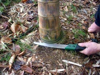 Pruning can be performed anytime during the year. However, it is not advisable to prune during the shooting season because of possible damage to new shoots. Bamboo can be removed with most any handsaw. You can see from the picture that even the largest of canes (that is a quarter sitting on the stump for perspective) can be removed with simple tools. Make sure that you have all the safety gear and proceed with caution. Bamboo is typically lightweight but can still be dangerous.