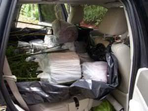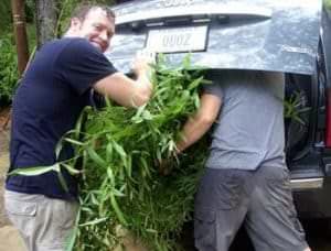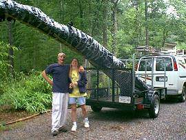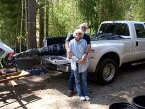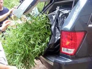 Appointments are made Monday through Friday, 9 am to 4 pm to select and pick up bamboo. On average each visit to our bamboo farm will last from 2 to 3 hours and is concluded with us preparing your bamboo for your trip home. We will make sure that your bamboo is properly loaded and protected for your ride home. We will load all your bamboo and protect it from wind for the journey home. We wrap larger orders in plastic to prevent wind damage. Smaller containers can just ride within the vehicle if there is room. Below you can see some large three gallon size plants being loaded. If you pick-up three gallon size plants you can usually get larger ones that cannot be shipped in the mail. Some of our packing methods occasionally entail employees getting closed insides doors.