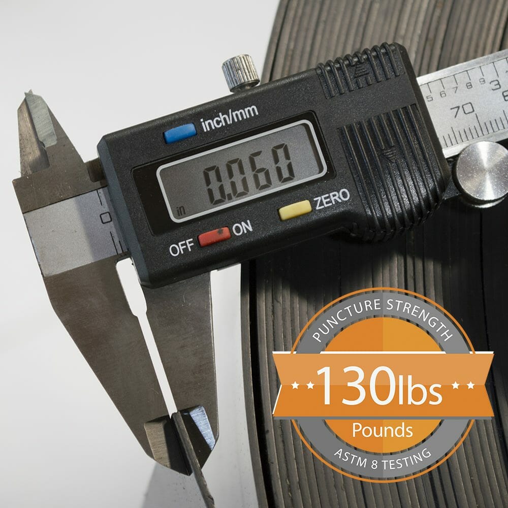 - 60 mil (1/16th inch or 1.5 mm) material thickness that provides 130 pound-force puncture resistance.