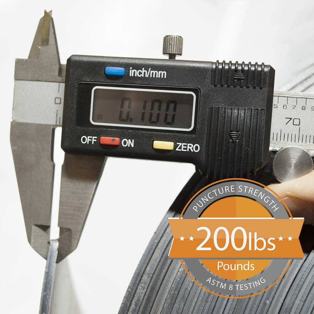 - 100 mil (1/10th inch or 2.5 mm) material thickness that provides 200 pound-force puncture resistance.