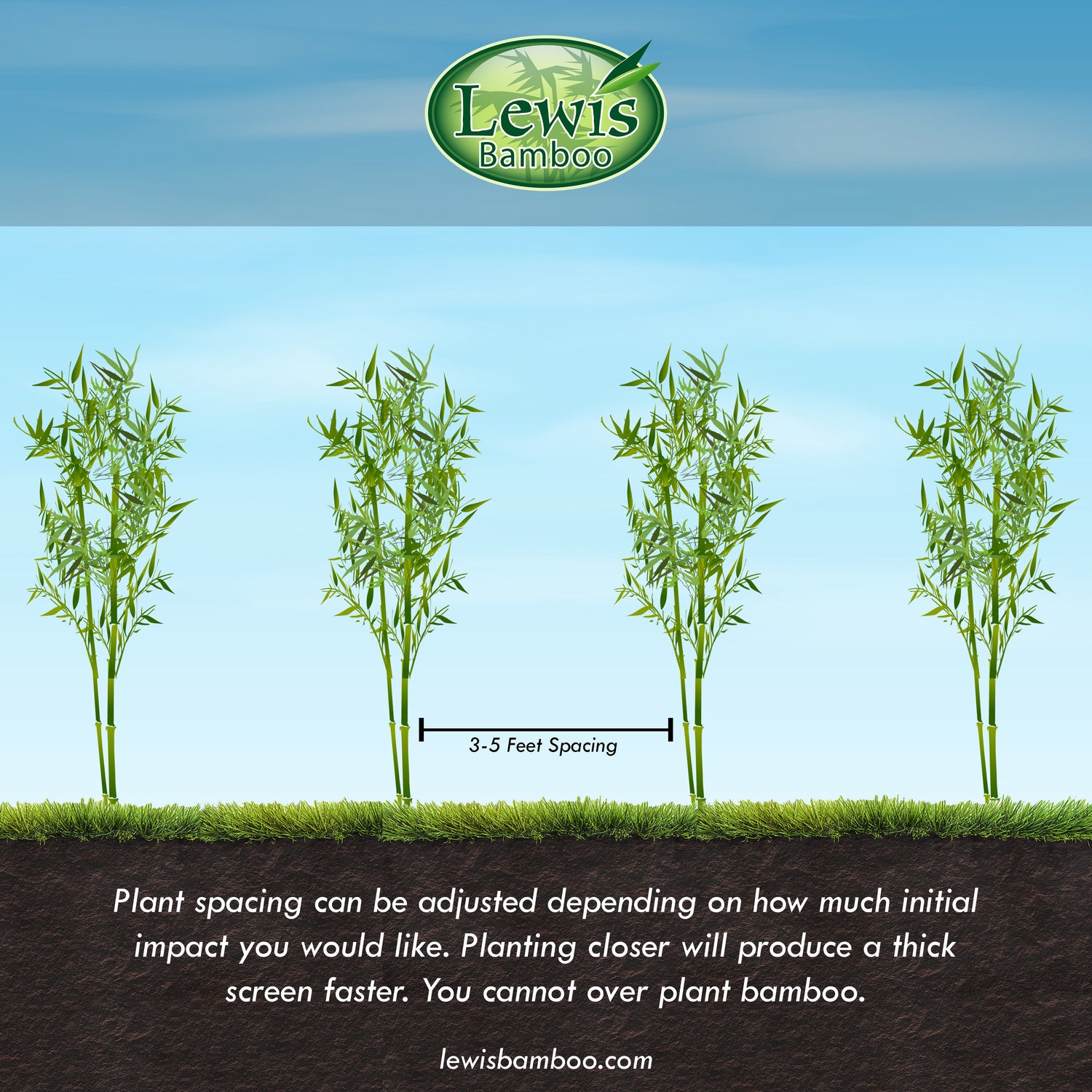 One division of bamboo will start a grove or screen over time. However, if you want a privacy screen fast, we recommend planting bamboo 3 to 5 feet apart. This will hopefully allow you to have a good screen in three years. There are a lot of factors such as water, sunlight, and climate zones that speeds up or slows down the process. Three years is about the average on this spacing, closer planting will allow you to screen or develop your grove faster. You cannot over plant bamboo.
